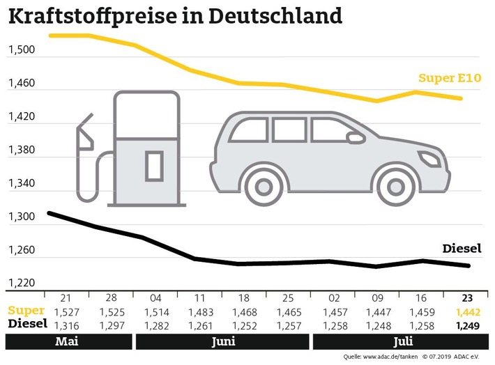 Nach einem kurzen Preishoch in der letzten Woche sind die Benzin- und Dieselpreise wieder gefallen. Dieser Rückgang an den Tankstellen ergab sich vor dem Hintergrund der auf rund 63 Dollar je Barrel und damit deutlich gesunkenen Rohölnotierungen. Laut aktueller Auswertung des ADAC kostet ein Liter Super E10 im bundesweiten Durchschnitt 1,442 Euro, das sind 1,7 Cent weniger als in der Vorwoche. Der Dieselpreis sank um 0,9 Cent auf 1,249 Euro je Liter.