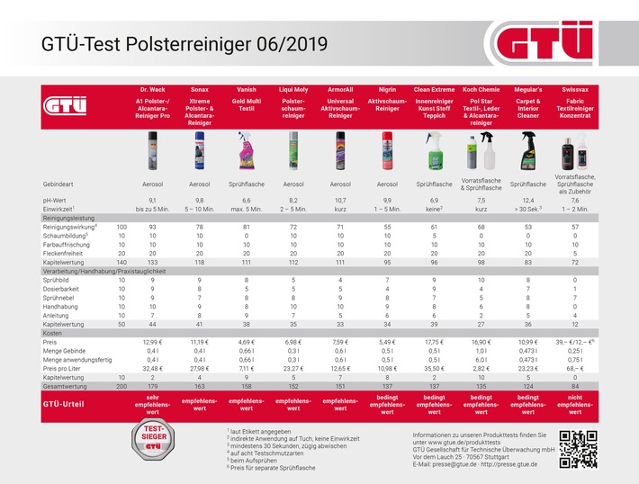 Die Sachverständigenorganisation GTÜ Gesellschaft für Technische Überwachung hat gemeinsam mit Auto Bild in einem Praxistest die Probe aufs Exempel gemacht und zehn gängige Polsterreiniger verglichen. Klarer Sieger mit dem Prädikat “sehr empfehlenswert” ist der A1 Polster-/Alcantara-Reiniger Pro von Dr. Wack (12,99 EUR), der die Schmutzarten am besten packt und sich am besten verarbeiten lässt (siehe Ergebnistabelle). Auf Platz zwei der “empfehlenswerte” Sonax Xtreme Polster- & Alcantara-Reiniger (11,19 EUR), dicht gefolgt vom Preis-/Leistungssieger Vanish Gold Multi Textil (4,69 EUR), einem Haushaltsreiniger, der wenig kostet, gründlich putzt und damit den dritten Platz in der Gesamtbewertung belegt. Auf den weiteren Plätzen die ebenfalls “empfehlenswerten” Polsterreiniger von Liqui Moly (6,98 EUR) und ArmorAll (7,59 EUR). Mit dem GTÜ-Urteil “bedingt empfehlenswert” schneiden die Schaumreiniger von Nigrin (5,49 EUR), Clean Extreme (17,75 EUR), Koch Chemie (16,90 EUR) und Meguiar’s (10,99 EUR) ab. Das teuerste Produkt im Test ist das Schlechteste, sowohl bei der Reinigungsleistung als auch bei der Anwendung: Swissvax Fabric Textilreiniger Konzentrat ist mit 39 Euro extrem teuer und landet somit “nicht empfehlenswert” auf dem letzten Platz.
