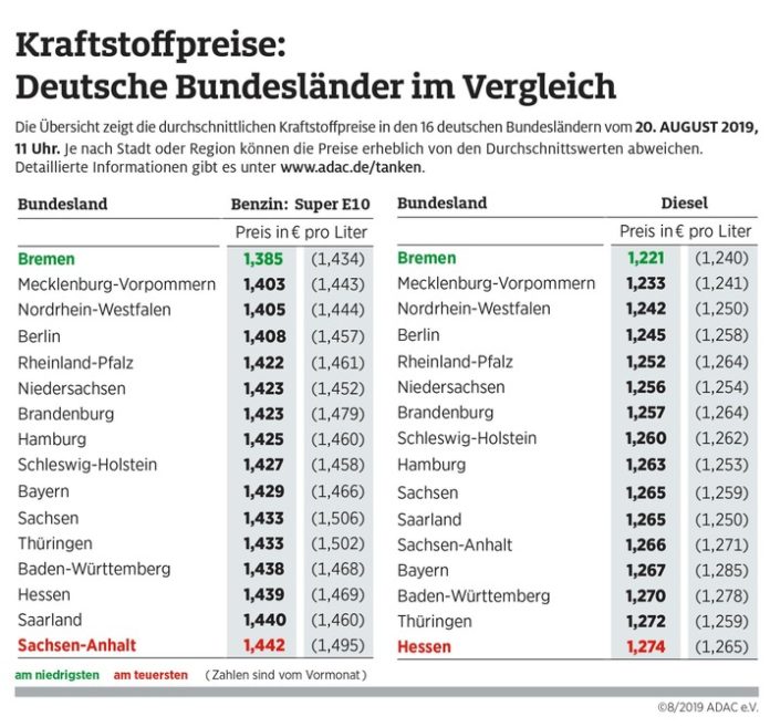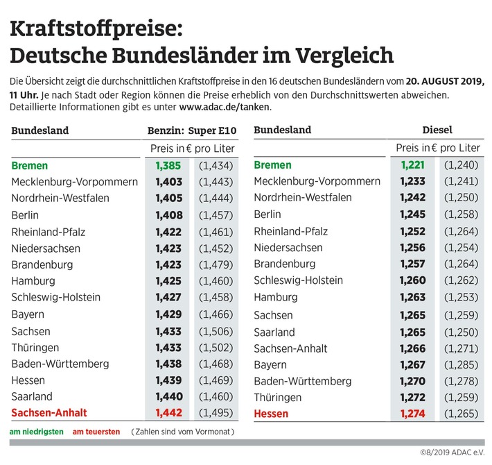 Wie bereits im Juli tanken Autofahrer deutschlandweit im Stadtstaat Bremen am günstigsten: Ein Liter Super E10 kostet hier durchschnittlich 1,385 Euro und damit 5,7 Cent weniger als im teuersten Bundesland Sachsen-Anhalt (1,442 Euro). Für einen Liter Diesel müssen Autofahrer in Bremen im Mittel 1,221 Euro und damit 5,3 Cent weniger als in Hessen bezahlen, wo diese Kraftstoffart mit 1,274 Euro je Liter derzeit am teuersten ist.