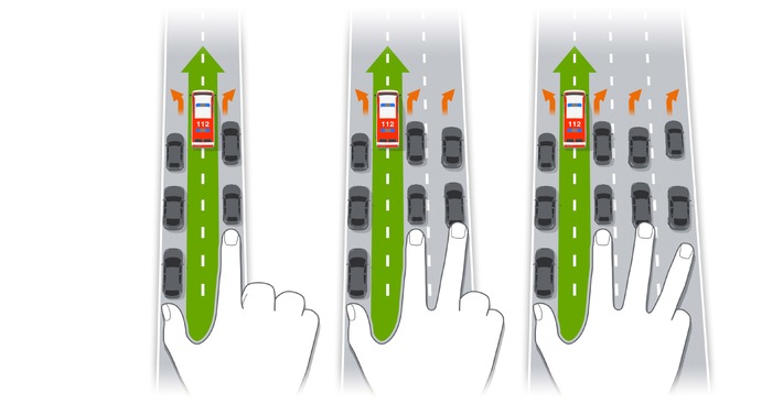 Auch die Lage der Rettungsgasse ist klar geregelt: Bei zwei Fahrstreifen ist die Gasse in der Mitte freizuhalten, bei drei und mehr Fahrstreifen liegt sie zwischen dem ganz linken und dem benachbarten Streifen. Als Merkhilfe dient ein Blick auf den rechten Handrücken: Die Lücke zwischen dem Daumen und dem Zeigefinger steht für die Lage der Rettungsgasse.