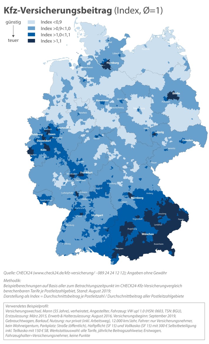 *Beispielberechnungen auf Basis aller zum Betrachtungszeitpunkt im CHECK24-Kfz-Versicherungvergleich berechenbaren Tarife je Postleitzahlgebiet, Stand: August 2019; Darstellung als Index = Durchschnittsbeitrag je Postleitzahl / Durchschnittbeitrag aller Postleitzahlgebiete; weitere Informationen zum verwendeten Beispielprofil hier einsehbar: http://ots.de/LMnhtQ