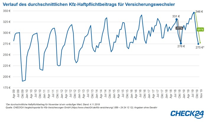 “Wir beobachten jedes Jahr, dass die Preise für die Kfz-Versicherung Richtung November fallen”, sagt Dr. Tobias Stuber, Geschäftsführer Kfz-Versicherungen bei CHECK24. “Versicherer versuchen neben den Leistungen auch durch attraktive Preise wechselwillige Kunden zu gewinnen. Verbraucher sollten mit dem Versicherungswechsel aber trotzdem nicht bis zum Stichtag am 30.11. warten, da einzelne Versicherer ihre Beiträge bereits vorher wieder erhöhen.”
