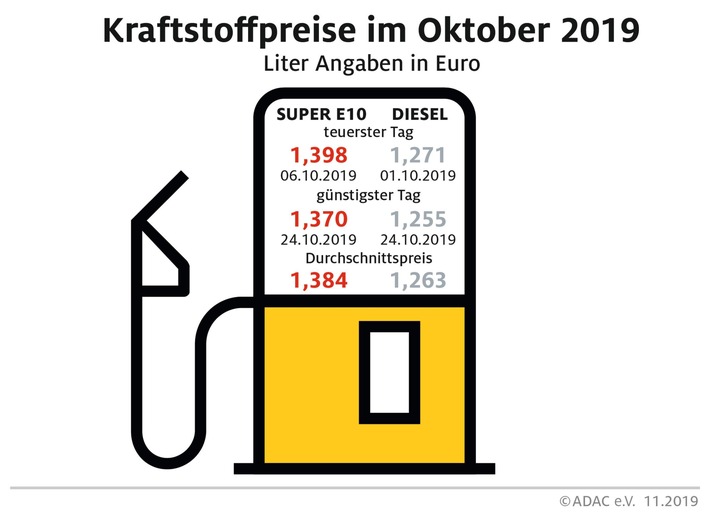 Am preiswertesten konnte man im vergangenen Monat beide Sorten am 24. Oktober tanken. An diesem Tag mussten Autofahrer für einen Liter Super E10 durchschnittlich 1,370 Euro und für einen Liter Diesel 1,255 Euro bezahlen. Am teuersten war Super E10 im bundesweiten Mittel mit 1,398 Euro je Liter am 6. Oktober, bei Diesel wurde der Monatshöchststand mit 1,271 Euro je Liter am 1. Oktober erreicht.