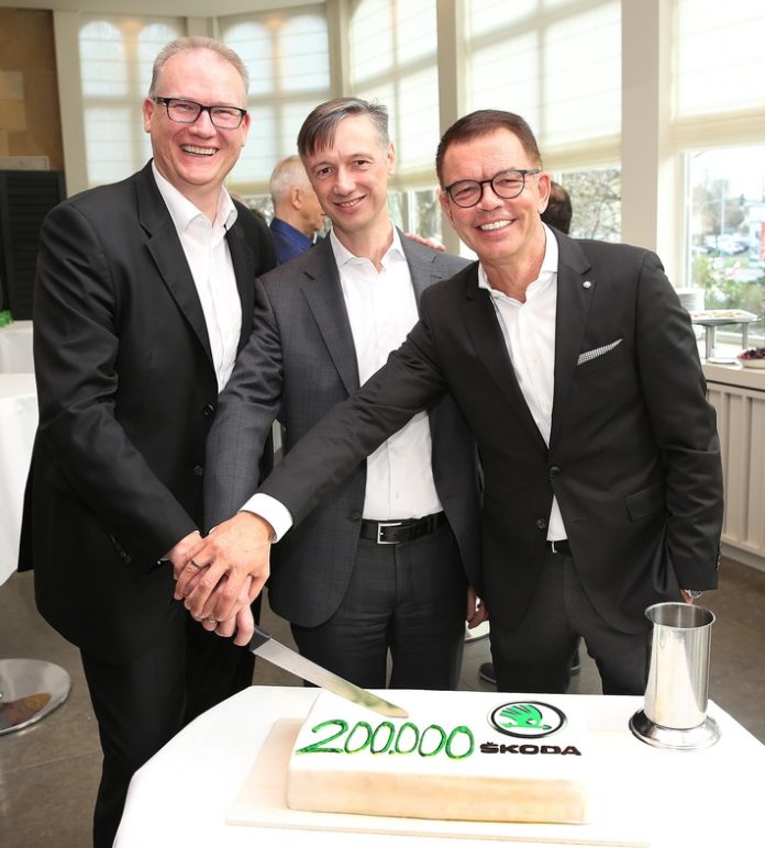 Über 200.000 neu zugelassene SKODA in Deutschland 2019: Frank Jürgens, Sprecher der Geschäftsführung von SKODA AUTO Deutschland (l.), Marek Balon, Geschäftsführer von SKODA AUTO Deutschland (Mitte) und Stefan N. Quary, Vertriebsleiter SKODA AUTO Deutschland (r.) freuen sich über das Rekordergebnis. Weiterer Text über ots und www.presseportal.de/nr/28249 / Die Verwendung dieses Bildes ist für redaktionelle Zwecke honorarfrei. Veröffentlichung bitte unter Quellenangabe: “obs/Skoda Auto Deutschland GmbH”