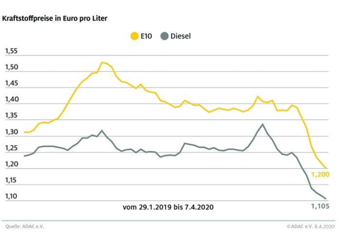 München (ots) – Die weltweite Corona-Krise lässt die Kraftstoffpreise an den Tankstellen weiter fallen. Laut aktueller Auswertung des ADAC müssen Autofahrer für einen Liter Super E10 im Bundesmittel 1,200 Euro bezahlen, das sind 1,7 Cent weniger als in der Vorwoche. Diesel verbilligte sich um 1,0 Cent auf durchschnittlich 1,105 Euro je Liter. Seit Jahresbeginn haben die Spritpreise damit um 23 Cent pro Liter nachgegeben.