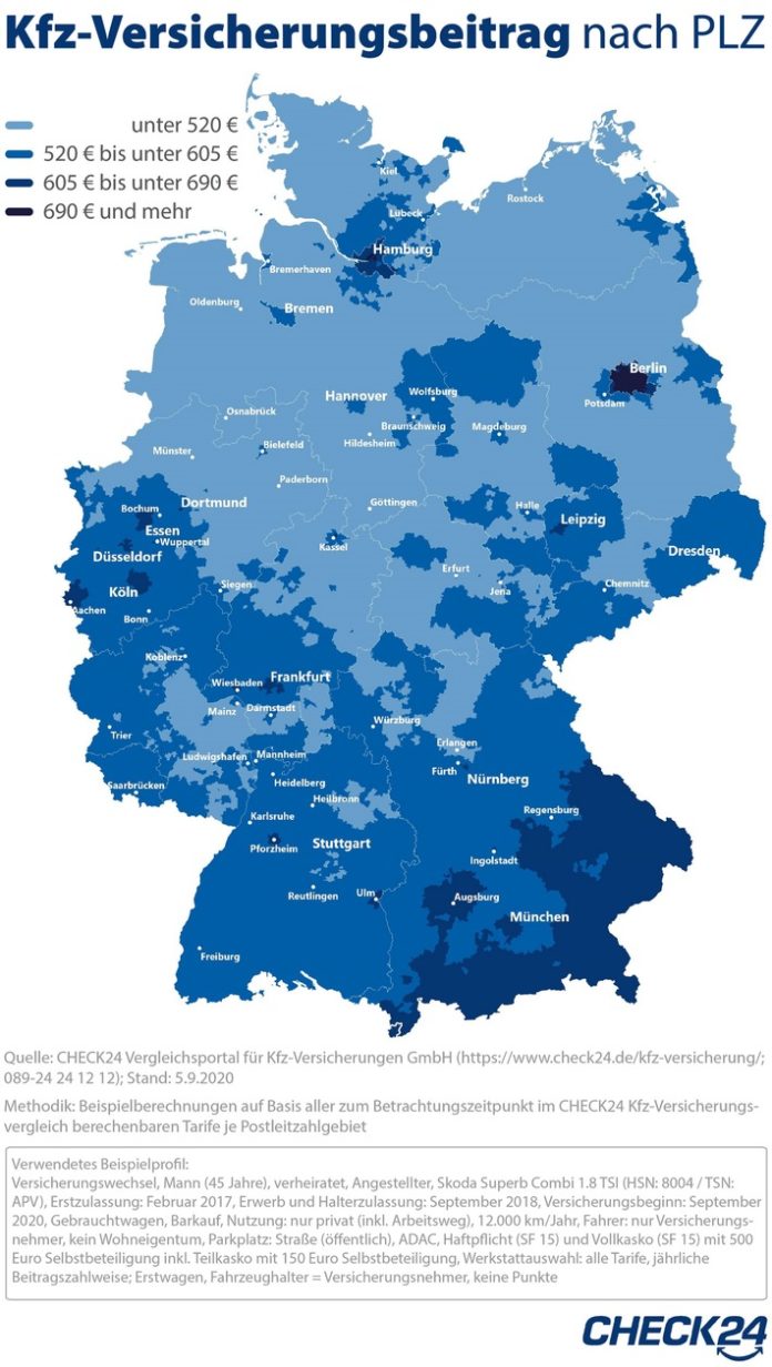 *Beispielberechnungen auf Basis aller zum Betrachtungszeitpunkt im CHECK24-Kfz-Versicherungsvergleich berechenbare Tarife je Postleitzahlgebiet, Stand: 5.9.2020; verwendetes Beispielprofil: Versicherungswechsel, Mann (45 Jahre), verheiratet, Angestellter, Skoda Superb Combi 1.8 TSI (HSN: 8004 / TSN: APV), Erstzulassung: Februar 2017, Erwerb und Halterzulassung: September 2018, Versicherungsbeginn: September 2020, Gebrauchtwagen, Barkauf, Nutzung: nur privat (inkl. Arbeitsweg), 12.000 km/Jahr, Fahrer: nur Versicherungsnehmer, kein Wohneigentum, Parkplatz: Straße (öffentlich), ADAC, Haftpflicht (SF 15) und Vollkasko (SF 15) mit 500 Euro Selbstbeteiligung inkl. Teilkasko mit 150 Euro Selbstbeteiligung, Werkstattauswahl: alle Tarife, jährliche Beitragszahlweise; Erstwagen, Fahrzeughalter = Versicherungsnehmer, keine Punkte