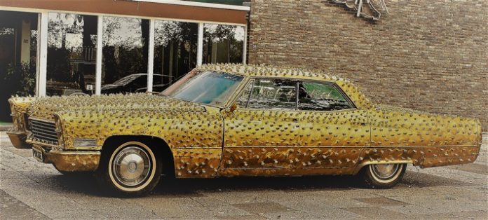 Der Luxus Cadillac Baujahr 1967 vom Öl Milliardär Jean Paul Getty wurde nach seiner letzten Fahrt von England nach Weert, Niederlande von Saxo feuersprühend in 100 Teile zerschnitten. Zuvor wurde der Wagen vom Autokünstler Heiko Saxo vergoldet und mit 2.222 Kronen und 100.000 Kristallen versehen.