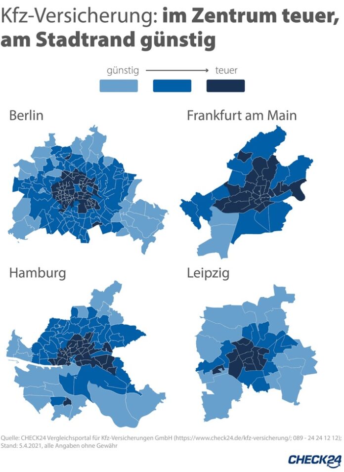 „Im Stadtzentrum ist der Verkehr meistens besonders dicht, weswegen es häufiger zu Unfällen kommt“, sagt Dr. Rainer Klipp, Geschäftsführer Kfz-Versicherungen bei CHECK24. „Vielfach mangelt es im Zentrum auch an Garagenstellplätzen, wodurch die Diebstahlgefahr steigt. Das berücksichtigen Versicherer bei ihrer Beitragsberechnung. Daher wird im Zentrum mehr für eine Kfz-Versicherung fällig als am Stadtrand.“