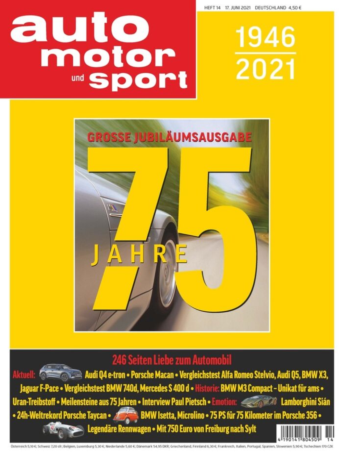 Morgen erscheint die prall gefüllte Ausgabe 14/2021 von AUTO MOTOR UND SPORT zum 75-jährigen Jubiläum der Autozeitschrift. Sie ist zu dem feierlichen Anlass mit einem aufwendig produzierten goldenen Cover veredelt. Die Redaktion um die beiden Chefredakteure Birgit Priemer und Michael Pfeiffer bietet in dem 246 Seiten starken Exemplar eine perfekte Mischung aus aktueller Berichterstattung und vielen spannenden Geschichten mit historischem Aufhänger, aus kompetenten Testberichten, bunten Reportagen wie beispielsweise eine Deutschland-Reise mit drei Autos zum Kaufpreis von jeweils 750 Euro und vielen weiteren überraschenden Themen.