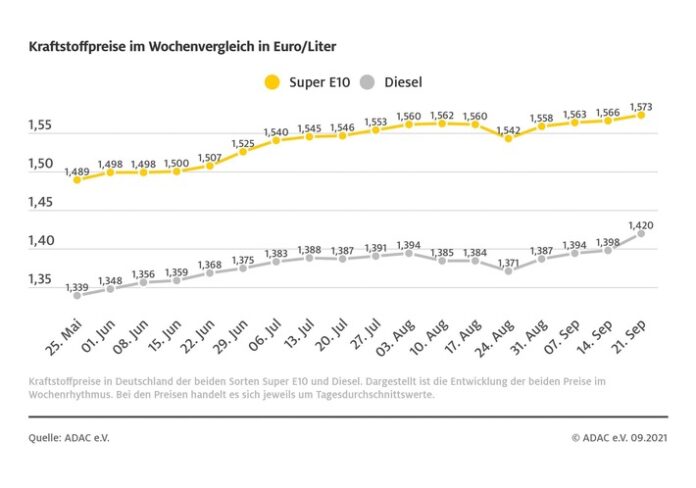 München (ots) – Die Spritpreise befinden sich weiter auf Höhenflug. Wie die aktuelle ADAC Auswertung der Kraftstoffpreise zeigt, stieg der bundesweite Durchschnittspreis für einen Liter Diesel im Schnitt um 2,2 Cent und lag zuletzt bei 1,420 Euro. Auch Super E10 verteuerte sich im Vergleich zur Vorwoche um 0,7 Cent auf 1,573 Euro je Liter.