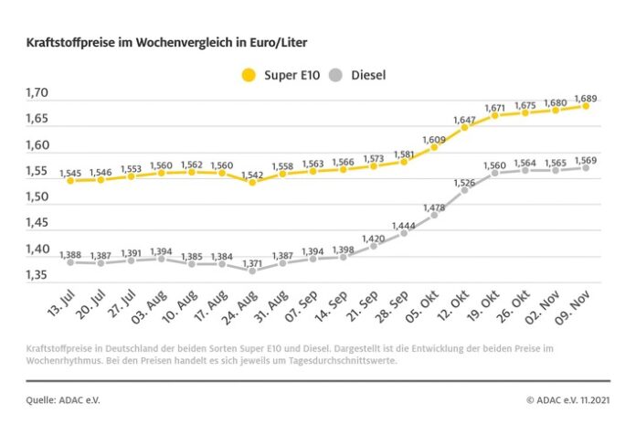 Tanken wird nach wie vor teurer. Das ermittelt der ADAC in seinem Wochenvergleich der Spritpreise. Ein Liter Super E10 kostet demnach im Bundesschnitt 1,689 Euro. Das entspricht einem Anstieg von 0,9 Cent gegenüber vergangener Woche. Beim Diesel ist ebenfalls ein Preisanstieg zu verzeichnen: 1,569 Euro kostet ein Liter im bundesweiten Mittel und somit 0,4 Cent mehr als in der Vorwoche.