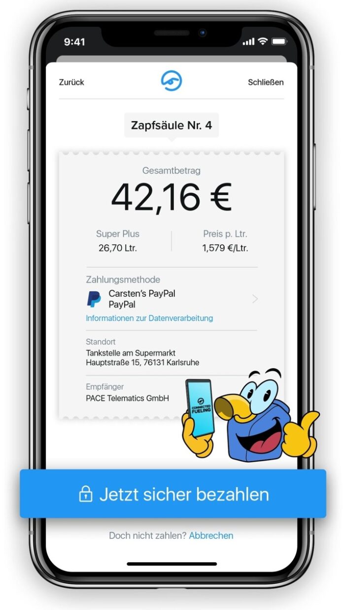 In der Praxis ist der Bezahlvorgang leicht, sicher und schnell: Die App erkennt automatisch, ob man sich gerade an einer der teilnehmenden Tankstellen befindet. Jetzt wird nur noch die Zapfsäule ausgesucht, die Transaktion wird autorisiert und schon kann man weiterfahren. Der Beleg wird bequem in der App hinterlegt.