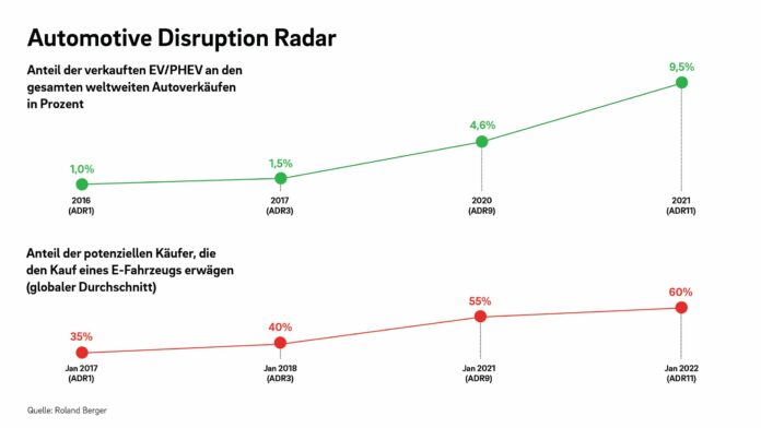 Trotz der schwierigen Wirtschaftslage und angespannten globalen Lieferketten boomt die Elektromobilität. So stieg der Anteil der E-Autos und Plug-in-Hybriden am weltweiten Neuwagenverkauf von 4,6 Prozent (2020) auf 9,5 Prozent (2021). Der Trend wird weiter anhalten. Denn weltweit ziehen bereits 60 Prozent der potenziellen Autokäufer ein Elektroauto als nächstes Fahrzeug in Erwägung. Dies zeigen die wichtigsten Ergebnisse des neuen „Automotive Disruption Radar (ADR)“ von Roland Berger. Die Studie erscheint halbjährlich und untersucht 26 Automobilindikatoren in 23 Ländern.