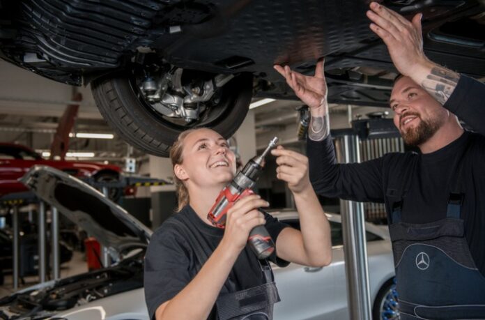 Mechatroniker*in (https://group.mercedes-benz.com/karriere/jobsuche/) ist ein Ausbildungsberuf, der zwei Bereiche verbindet: Elektronik und Mechanik. In den Mercedes-Benz-Werkstätten treffen die Auszubildenden (m/w/d) auf Digitalisierung und Virtual Reality, und arbeiten an alternativen Antriebstechnologien sowie unterschiedlichen Themen der Fahrzeugelektronik. E-Auto, Hybrid, autonomes Fahren werden genauso ihr Daily Business wie Bremsen, Lenkung, Getriebe, Fahrwerk und Motormanagement. Dazu kommen Batterietechnologien, Elektroantriebe und Bordnetze. Die Auszubildenden (m/w/d) liefern mit erfahrenen Kolleg*innen einen wichtigen Beitrag für die Zukunft der Automobilbranche und die Kunden hinterm Steuer.