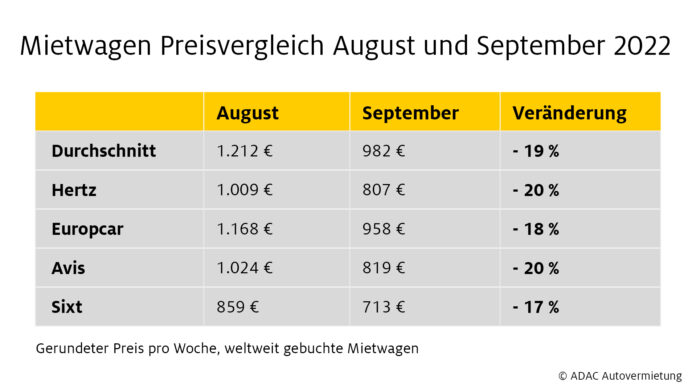ADAC Autovermietung: Mietwagenpreise für Ferienregionen sinken im September um 19 Prozent Durchschnittliche Wochenmiete für Ferienmietwagen im September 2022 beträgt 230 Euro weniger als im August