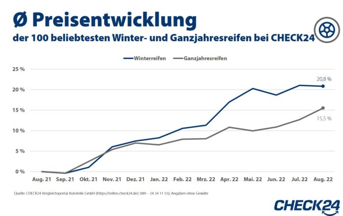 • Ganzjahresreifenpreise im Vergleich zu August 2021 um knapp 16 Prozent gestiegen