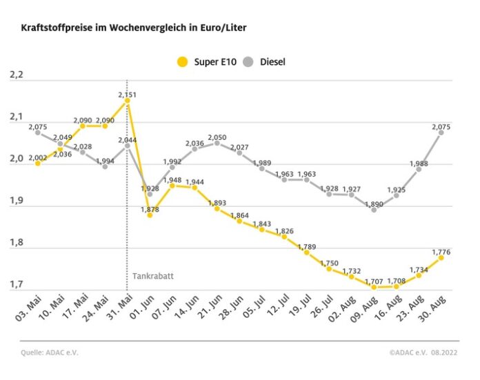 Bereits vor dem offiziellen Ende des Tankrabatts ziehen die Kraftstoffpreise kräftig an. Das ermittelt der ADAC in seiner wöchentlichen Auswertung der Spritpreise. Ein Liter Super E10 kostet derzeit im bundesweiten Mittel 1,776 Euro. Im Vergleich zu Vorwoche entspricht das einem Anstieg von 4,2 Cent. Beim Diesel ist der Preissprung noch größer. Ein Liter kostet derzeit im Bundesschnitt 2,075 Euro – 8,7 Cent mehr als noch vor einer Woche.