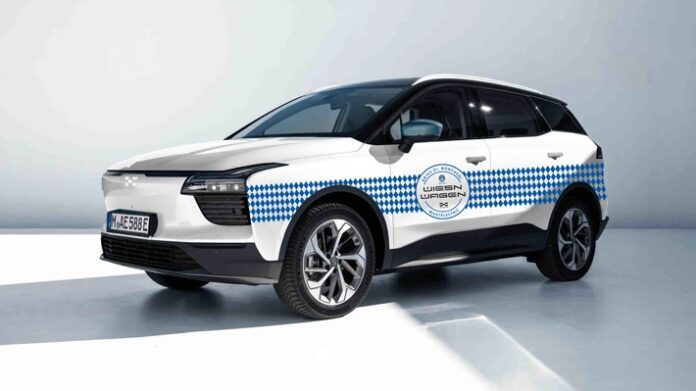 Unter dem Titel „Wiesn-Wagen“ hat Aiways, Anbieter von individuellen Mobilitätslösungen mit Sitz in Shanghai, ein ganz besonderes Einzelstück für das diesjährige Oktoberfest geschaffen. Schon auf den ersten Blick sind die weiß-blauen Rauten, auch Wecken genannt, der bayerischen Staatsflagge zu erkennen. Der besondere Aiways U5 SUV grüßt die Passanten während der Veranstaltungstage mit einem „O’zapft is!“ auf der vorderen Haube in Form einer Grafik, die einen Zapfhahn mit einem Ladestecker kombiniert. Auf den Fahrzeugseiten findet sich ein großes Logo, dass auf den „Wiesn-Wagen“ hinweist und auf der Innenseite des Panorama-Glasdachs erstrahlt auf fast zwei Quadratmetern der „Himmel der Bayern“.