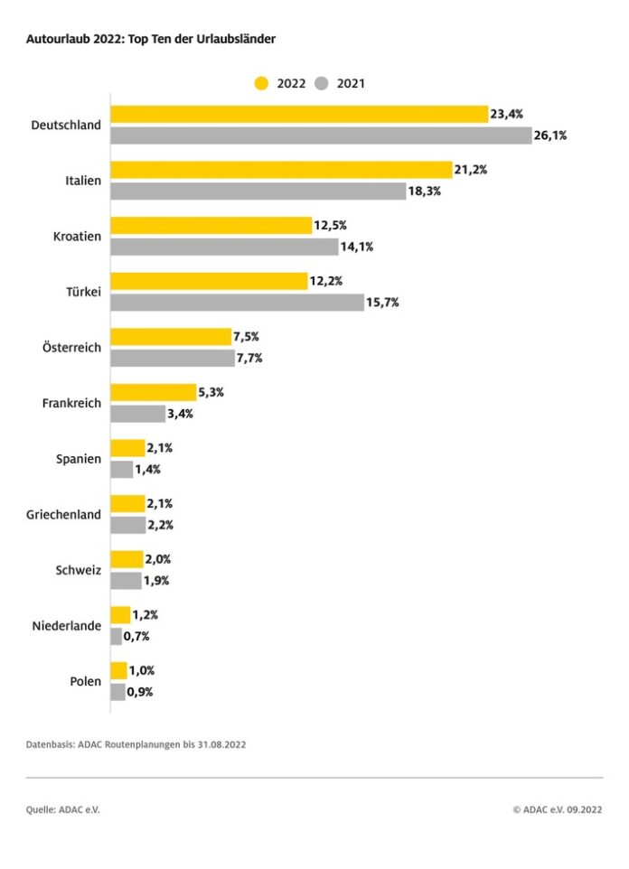 ADAC Bilanz Reisesommer 2022: Deutschland bleibt beliebtestes Reiseland, Italien fast gleichauf.