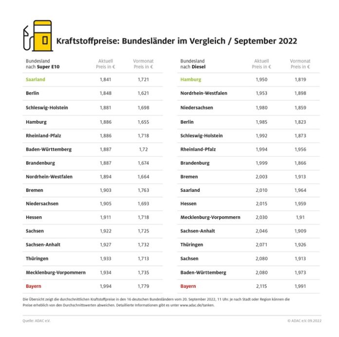 Kraftstoffpreise: Bayern mit Abstand am höchsten Saarland bei Benzin am günstigsten, Hamburg bei Diesel – Kraftstoffpreise: Bundesländer im Vergleich / September 2022 – Kraftstoffpreise in den 16 Bundesländern.