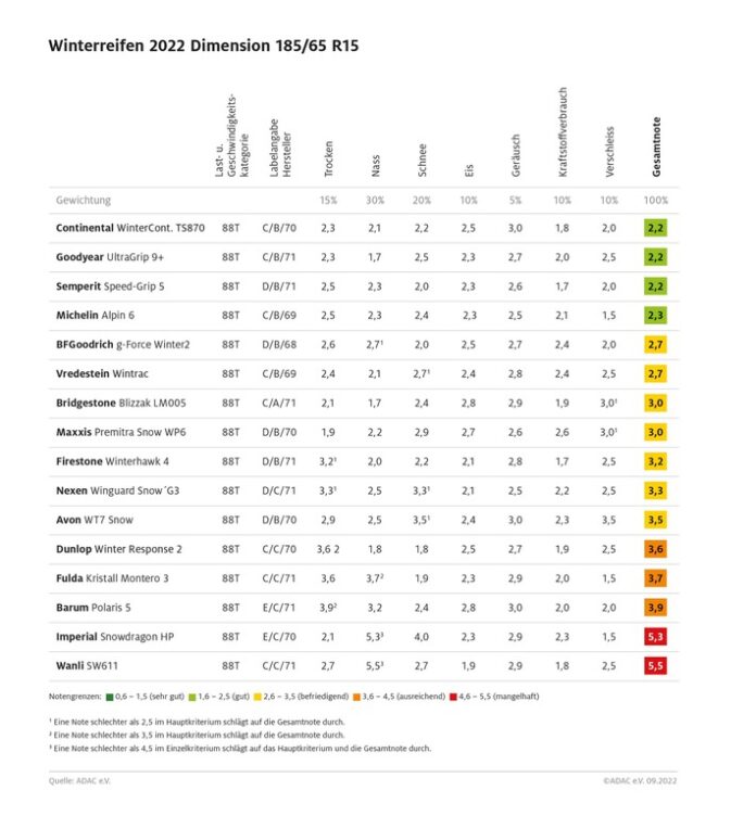 In der Dimension 185/65 R15 (T) für VW Polo, Audi A1 oder Opel Corsa sind die Reifen von Continental, Goodyear, Semperit und Michelin sehr ausgewogen, zeigen insbesondere auf Nässe, Schnee und trockener Fahrbahn gute Leistungen und bekommen daher das ADAC Urteil „gut“. Danach folgt ein breites Mittelfeld, das mit wachsenden Einschränkungen parallel zu den absteigenden Platzierungen empfohlen werden kann. Hier spart ein genauer Blick in die Ergebnistabelle bares Geld, denn in dieser Dimension sind die guten Reifen nicht sehr viel teurer als die Modelle mit Einschränkungen.