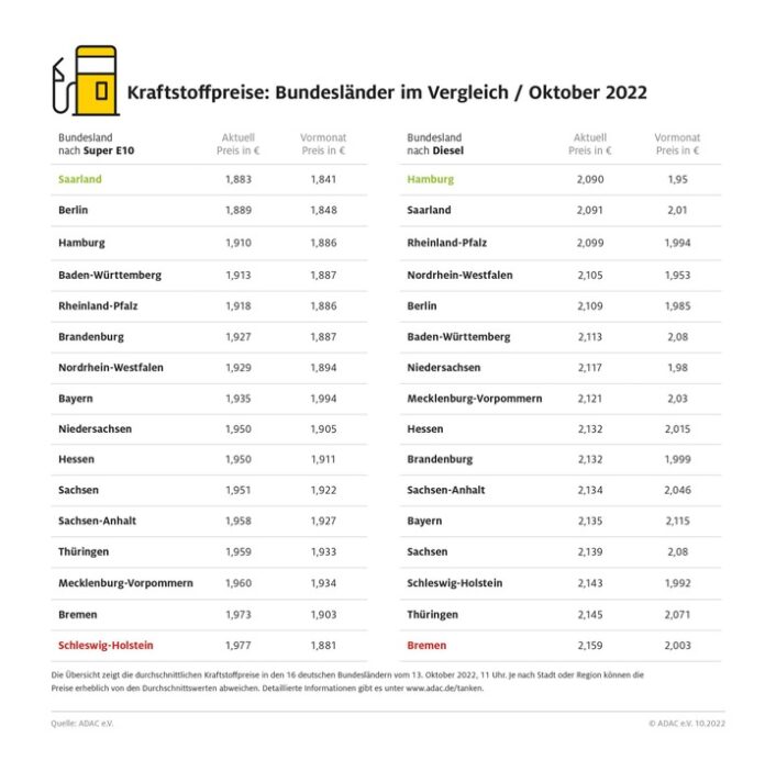 München (ots) – Der letzte Preissprung setzt ganz Deutschland zu, doch aktuell müssen Autofahrerinnen und Autofahrer in großen Teilen von Norddeutschland beim Tanken am tiefsten in die Tasche greifen. So werden laut heutiger ADAC Auswertung der Kraftstoffpreise in den 16 Bundeländern in Bremen 2,159 Euro für einen Liter Diesel fällig. Super E10 ist in Schleswig-Holstein mit 1,977 Euro pro Liter am teuersten. Insgesamt ist das Tanken im Saarland derzeit am günstigsten: E10 gibt es hier für 1,883 Euro je Liter, Diesel kostet im Schnitt 2,091. Hier ist nur Hamburg mit 2,090 Euro einen Hauch billiger.