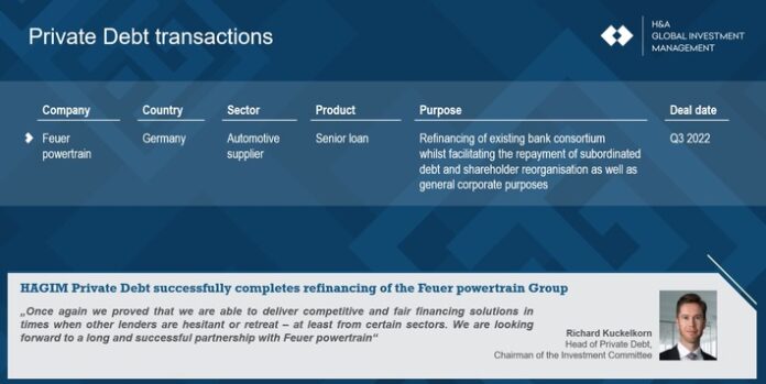 „Mit der zugeschnitten Finanzierungslösung über 40 Mio. EUR bieten wir Feuer powertrain Finanzierungssicherheit über die typische Finanzierungslaufzeit von klassischen Banken und ermöglichen ein hohes Maß an Flexibilität um operative sowie strategische Maßnahmen umzusetzen“, sagt Richard Kuckelkorn, Head of Private Debt bei HAGIM.