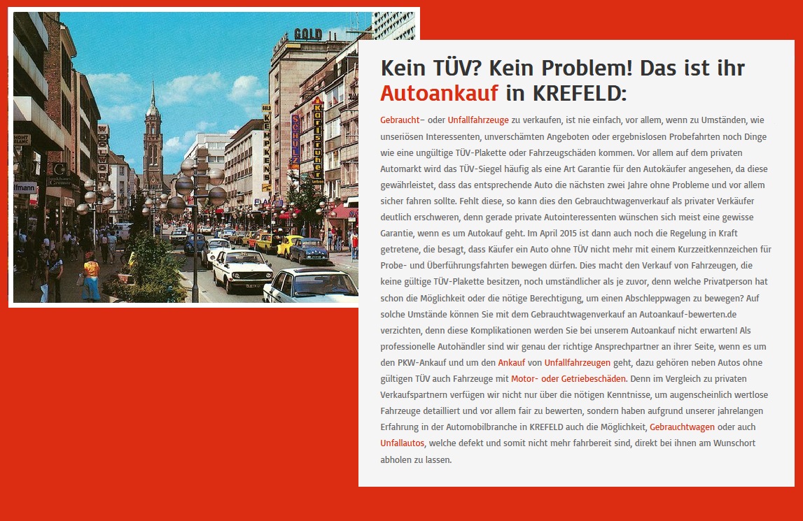 Um den Gebrauchtwagen letztendlich erfolgreich verkaufen zu können, dürfen auch Innenaufnahmen nicht fehlen – ebenso wenig wie ein ansprechender Verkaufstext. So gern der Verkäufer sein Fahrzeug zu einem guten Kurs verkaufen möchte: Beim Text sollte er sich keinesfalls dazu hinreißen lassen, Mängel des Fahrzeugs zu verschweigen oder gar falsche Angaben zu machen. Ein privater Käufer hat im Streitfall viele Möglichkeiten, den erzielten Verkaufspreis auch nachträglich zu drücken oder vom Kauf komplett zurückzutreten. In gravierenden Fällen droht sogar eine Betrugsanzeige. Einfacher ist hier ein Verkauf an den Autoankauf Krefeld ohne jede Gewährleistungsverpflichtung.