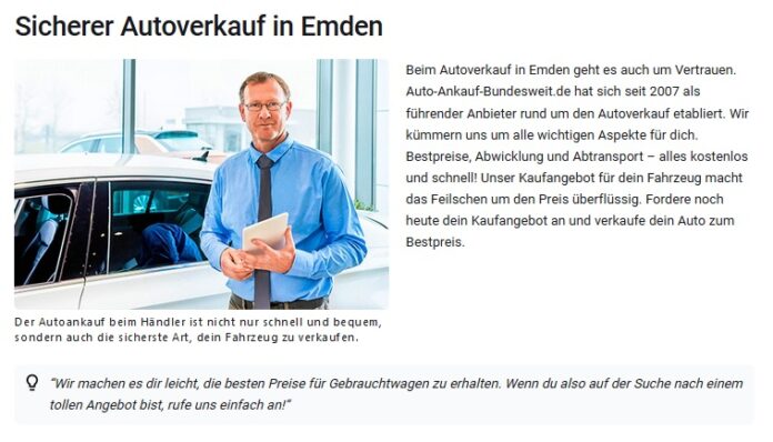Wem dies alles zu heikel ist, hat noch eine andere Möglichkeit: Er setzt sich ganz einfach mit dem Autoankauf Emden in Verbindung und bittet diesen um ein Angebot, das für den Verkäufer nicht verpflichtend, aber auf Wunsch dennoch unverzüglich in einen Kauf gewandelt werden kann. Insbesondere beim Verkauf von Gebrauchtwagen mit Mängeln schützt der Verkauf an den gewerblich handelnden Autoankauf Emden den Autobesitzer vor Unannehmlichkeiten nach dem Verkauf.