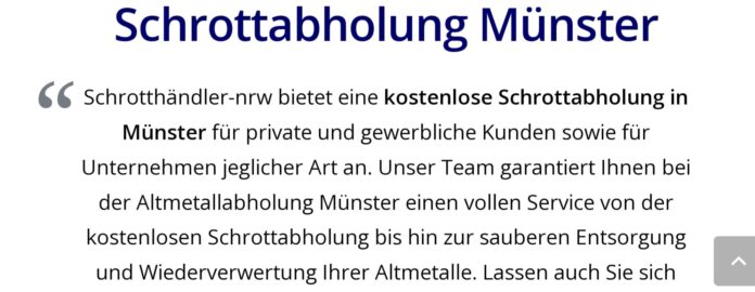 Die Schrottabholung Münster bietet nicht nur eine einfache und bequeme Gratis-Abholung für Privatkunden, sondern auch einen umweltfreundlichen Service für gewerbliche Kunden. Termine können unter Schrottabholung Münster vereinbart werden.