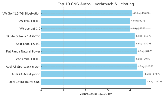 Die folgende Liste zeigt zehn der bekanntesten und bewährtesten CNG-Fahrzeuge, die durch geringe Emissionen, niedrigen Verbrauch und gute Alltagstauglichkeit überzeugen.